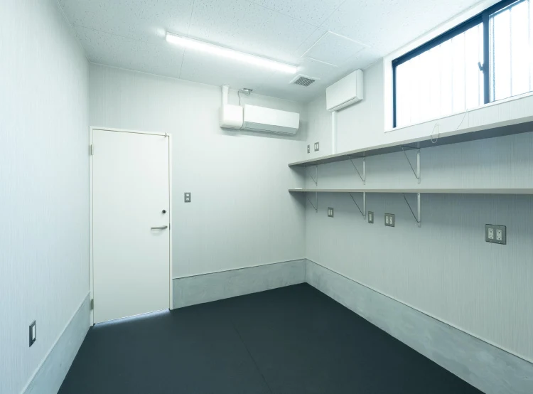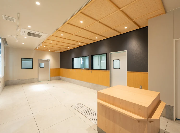 伝統的な地域につき、周囲に対し圧迫感を減らすため道路から建物をセットバックし、お客様の駐車しやすさ、作業室内部の使い勝手、バックヤード搬出入の利便性、そして角地のメリットを活かせる配置・平面計画を、四代目店主様とじっくりご相談の上つくりあげてゆきました。